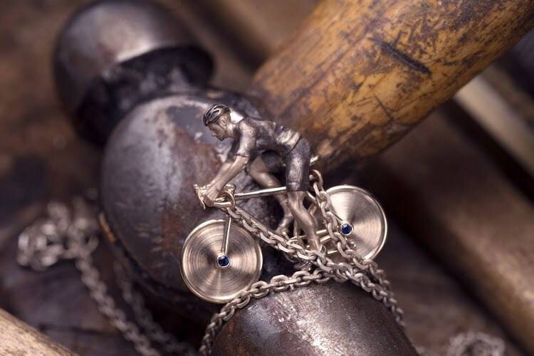 Механическая подвеска с крутящимися колесами из белого золота с сапфирами.