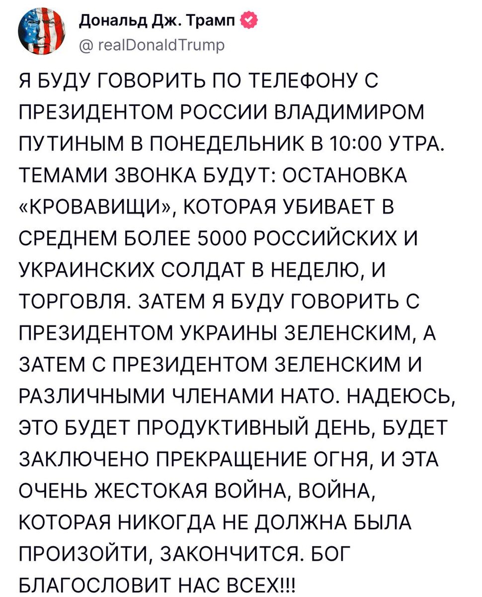 Трамп заявил, что в понедельник позвонит Путину и Зеленскому и установит режим прекращения огня в Восточной Европе