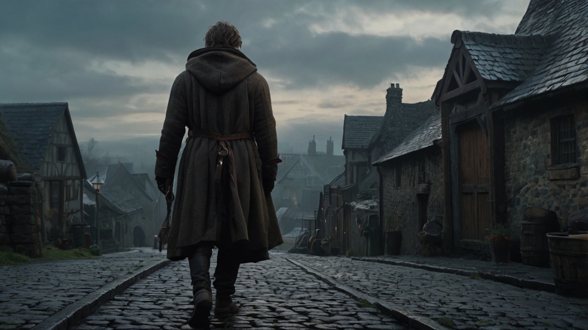 На улице раздался скрип колёс — первый звук утра, будто первая нота в тишине. Мирослав вышел из трактира «Корабельный колокол», прижимая к груди потёртую сумку. Плечи болели от вчерашнего напряжения, но походка его была уверенной. Ботинки глухо стучали по камням — каждый шаг звучал как обещание: вперёд.