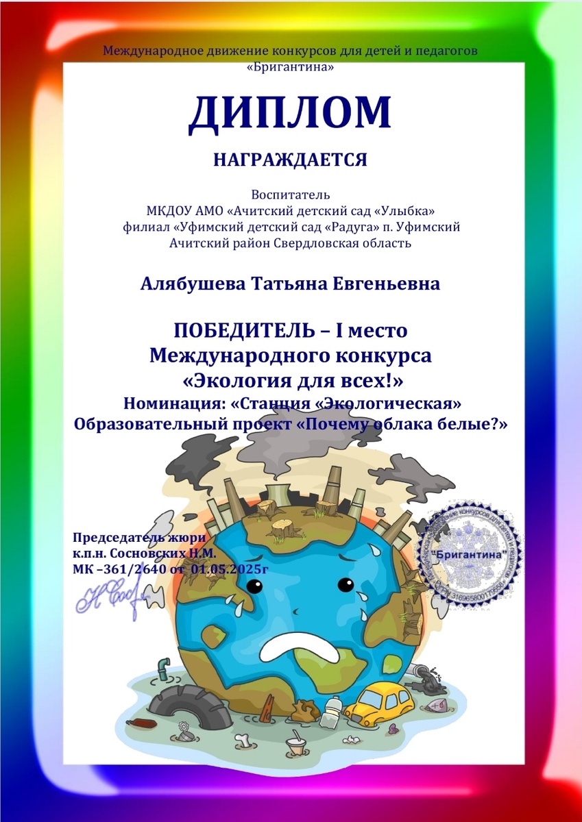 В апреле воспитатель Алябушева Т. Е. приняла участие в Международном конкурсе "Экология для всех!", в котором заняла 1 место.