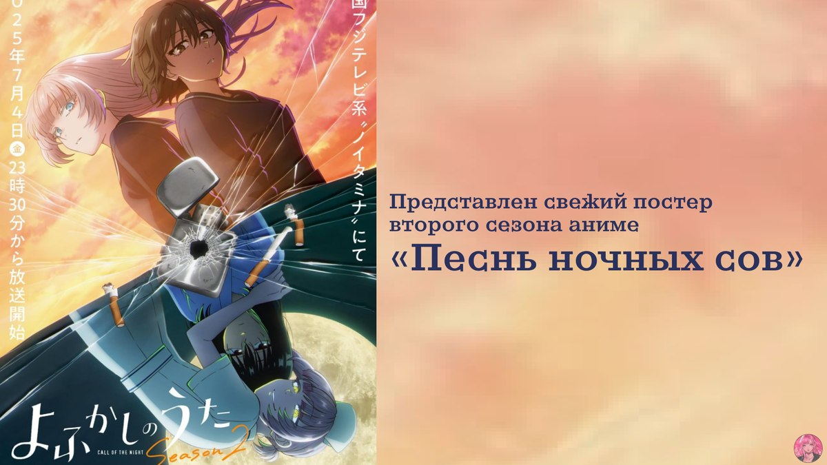 Твоя подписка и лайк — это огромная поддержка для меня! Я ценю каждого из вас и с радостью буду радовать новыми подборками и обзорами. Присоединяйся к нашему аниме-сообществу!🌸 Студия LIDENFILMS официально представила свежий постер к долгожданному второму сезону аниме «Песнь ночных сов» (Yofukashi no Uta). Премьера новых серий запланирована на 4 июля 2025 года. Аниме основано на популярной манге Кэндзи Фукусимы и рассказывает историю о мальчике Ко, который однажды ночью встречает загадочную девушку Нана, и его жизнь меняется навсегда. Сериал сочетает в себе мистику, романтику и драму, погружая зрителя в атмосферу ночного города и тайны вампиров. Первый сезон получил положительные отзывы за необычную атмосферу, глубоких персонажей и стильную анимацию. Второй сезон обещает продолжить раскрывать загадки и отношения героев, а также представить новых персонажей. А вы уже смотрели «Песнь ночных сов»? Что думаете о сюжете и атмосфере? Делитесь мнением в комментариях! Спасибо что дочитали ст