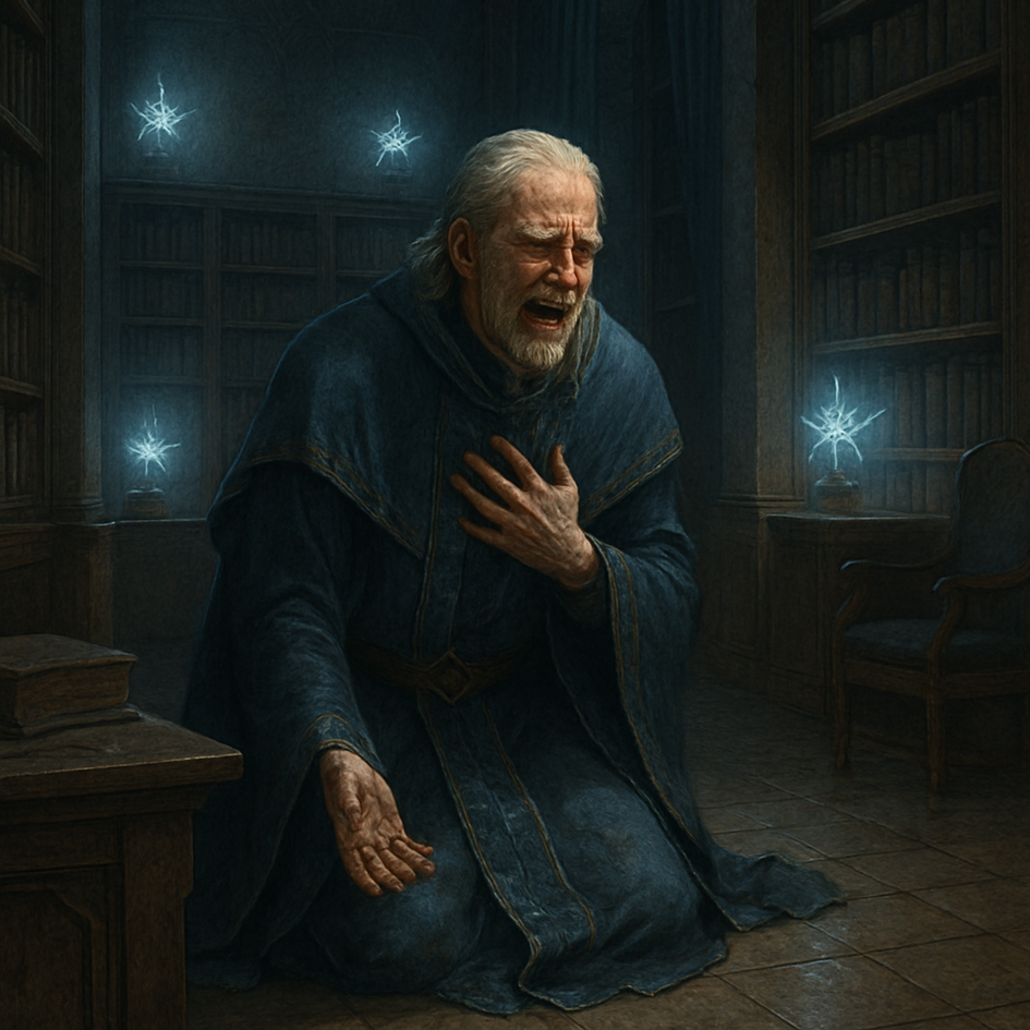 Но сегодня... сегодня в этой комнате, где всё впитано магией, где каждый предмет помнит его голос, где стены насыщены его присягами, он стоял в молчании — и не узнавал себя. Сегодня что-то в нём расползалось. Не слом. Не отказ. А утрата контура. Как будто образ, столь долго вычерчиваемый на пергаменте мира, вдруг утратил очертания. Как будто кто-то провёл ладонью по сложной диаграмме судьбы — и линии размылись.