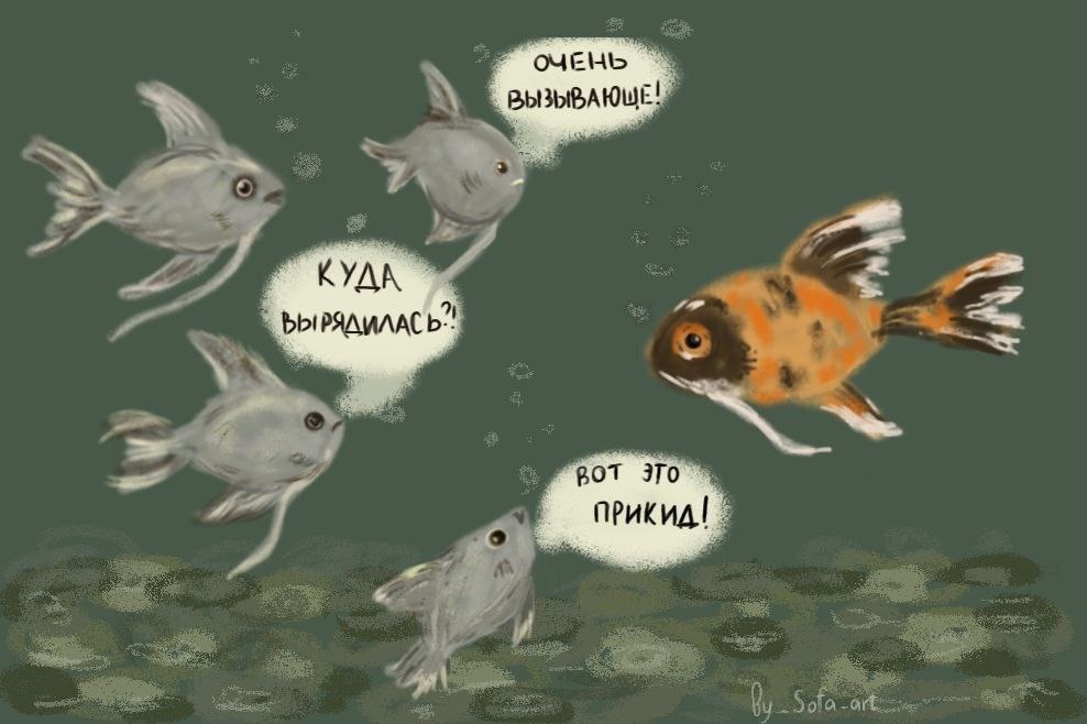 Рыбьи разборки. Во время очередного шараханья по городу мы попали под дождь. Укрыться решено в павильоне рынка: там и поесть, и деньги потратить, и на животных в зоомагазине посмотреть можно. В этот зоомагазин мы заходим часто, но исключительно с целью зыринга. Никита любит смотреть на змею, которая не меняет своего положения вообще никогда. Антон любит смотреть на цены и радоваться, что нам ничего из этого не нужно. Я всегда залипаю на рыбах. Ну потому что нельзя быть на свете красивой такоооой... (Пропели, да?) Серьёзно, зачем им в морских глубинах такие красивые наряды?! В одном из аквариумов заметила вот такую сценку. 😏 Завидуют ли рыбы другим из-за цвета чешуи? В другом тоже было кое-что интересное, но это я покажу вам потом. #зарисовки_для_рисовки #позитив