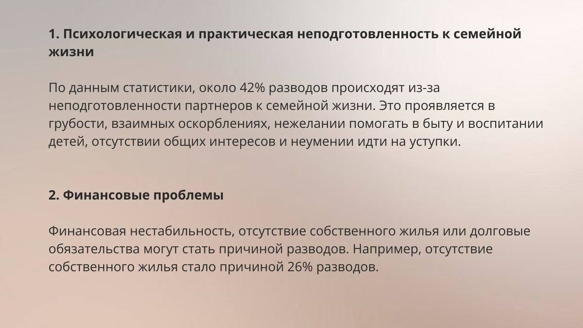 - 42% разводов — из-за эмоциональной и бытовой незрелости;