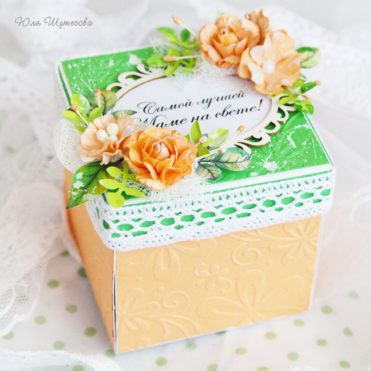 Представляю вашему вниманию оригинальную открытку-коробочку для мамы. Эту коробочку я делала на заказ к Дню рождения мамы заказчицы. Для этой работы была выбрана яркая цветовую гамму: оранжевый, персиковый, зеленый, белый. Палитру согласовывала с заказчицей. Коробочка в собранном виде 8 х 8 х 8 см. Основа коробочки выполнена из дизайнерского картона белого цвета. Каждая внешняя стеночка украшена кардстоком персикового цвета с цветочным тиснением (рельефный рисунок). Делала этот рисунок с помощью папки для тиснения. Ее основа тоже из дизайнерского картона. Основа оформлена дизайнерской бумагой зеленого цвета с добавлением белой акриловой краски и цветочной композицией из бумажных цветов ручной работы (розочек и цветов с тычинками), зеленушек, авторских отрисовок (листиков) и тычинок. В центральной части ажурная рамочка (чипборд из пивного картона) с надписью. А на бортиках красуется ажурное кружево. Внутри коробочки спрятан пышный букетик из роз, зеленушек, сверху которых порхают бабоч