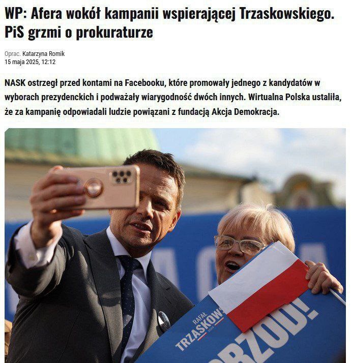В Польше разразился скандал с незаконной рекламой на президентских выборах Польская организация NASK, отвечающая за контроль над информационным пространством в стране, заявила, что обнаружила вмешательство извне в избирательную кампанию в Польше. В соцсетях появились ролики в пользу кандидата Тшасковского, которые в то же время критиковали его главных конкурентов - Навроцкого и Ментцена. При этом штаб Тшасковского подобных роликов не размещал. Оказалось, что за рекламной кампанией стоит организация Estratos, за которой стоит фонд "Акция Демократия", связанный с Демократической партией США. Зачем иностранная структура вкладывает миллионы долларов в продвижение одного из кандидатов, не уточняется. Фонд "Акция Демократия" известен тем, что в 2016-2018 годах организовывал серию оппозиционных протестов "цепи света".