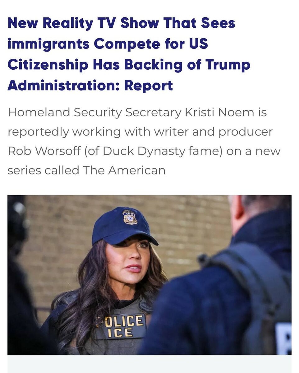 🔥 Шокирующий анонс: Экс-президент США Дональд Трамп, известный своей жесткой миграционной политикой, объявил о создании революционного реалити-шоу «The American». В нем 12 нелегальных мигрантов будут соревноваться за главный приз — гражданство США. Проект уже назвали «американскими Голодными играми». Хотя администрация Трампа активно продвигает проект, официальный статус шоу остается под вопросом. Роб Уорсофф уверен: «Это не антиутопия, а история о том, как мечты становятся реальностью». Но пока зрителям остается только гадать: станет ли «The American» новым словом в телевидении или скандальным провалом. Подписывайтесь на наш Telegram-канал, чтобы не пропустить эксклюзивные интервью с участниками шоу! Источники: The Wall Street Journal, Daily Mail, официальные заявления DHS.