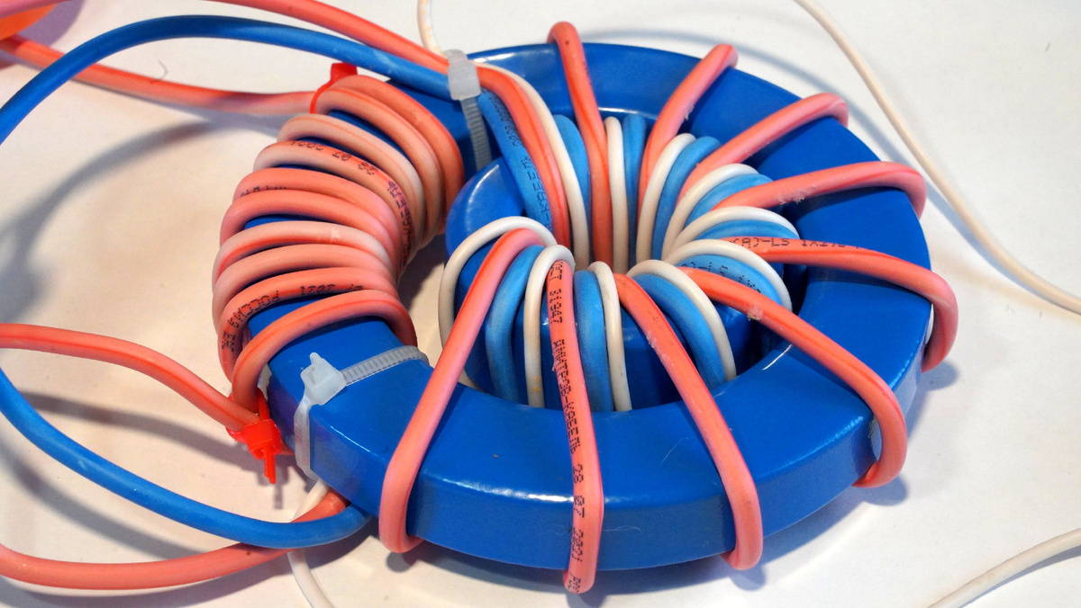 Логично предположить, что если сделать количество витков на первичной обмотке большого кольца в два раза меньшим, то напряжения на входе и выходе сравняются. Что и было сделано. Количество витков первичной обмотки было уменьшено до трёх. Все прочие обмотки были сокращены до шести витков.