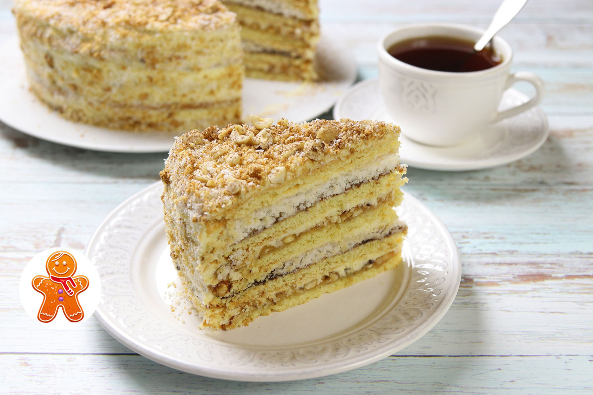 Собранный торт оставляем на 1-2 часа на рабочем столе при комнатной температуре, чтобы торт пропитался и затем убираем на несколько часов в холодильник, чтобы торт хорошо пропитался и хорошо охладился.