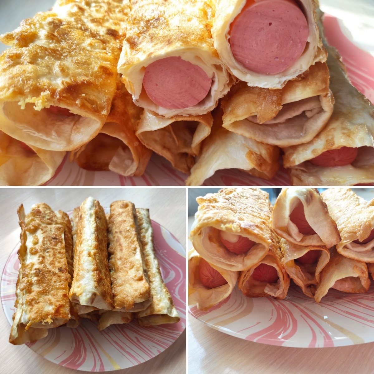 Лист лаваша, сосиски 8 шт, сыр 150г, яйцо 1 шт. Разделить лаваш на 8 частей ( делением надвое). Распределить на лаваше натёртый сыр, положить сосиску, свернуть лаваш рулетиком. Обмакнуть во взбитом яйце и обжарить на растительном масле со всех сторон до золотистой корочки. Лаваш, творожный сыр - 140г , слабосолёная сёмга 150 г, свежий огурец, укроп, зелёный лук. Лаваш намазать творожным сыром, посыпать мелко нарезанной зеленью, разложить рыбу и огурец. Свернуть плотным рулетом, дать пропитаться 30 минут в холодильнике. Нарезать острым ножом на ломтики, толщиной 1-1,5 см. 2 листа лаваша, 2 яйца для смазывания. Начинка с творогом: 200 г творога, горсть изюма, 1 яйцо, пакетик ванильного сахара, 2 ч л. сахара. Начинка с сыром и курицей: 100г сыра, копчёное куриное бедро. Листы лаваша разрезать ножницами на полосы, шириной около 6-8 см. Из одной полосы можно свернуть 1 большой конвертик или 2 маленьких. Подложить немного начинки на край лаваша, загнуть край треугольником, и завернуть начи