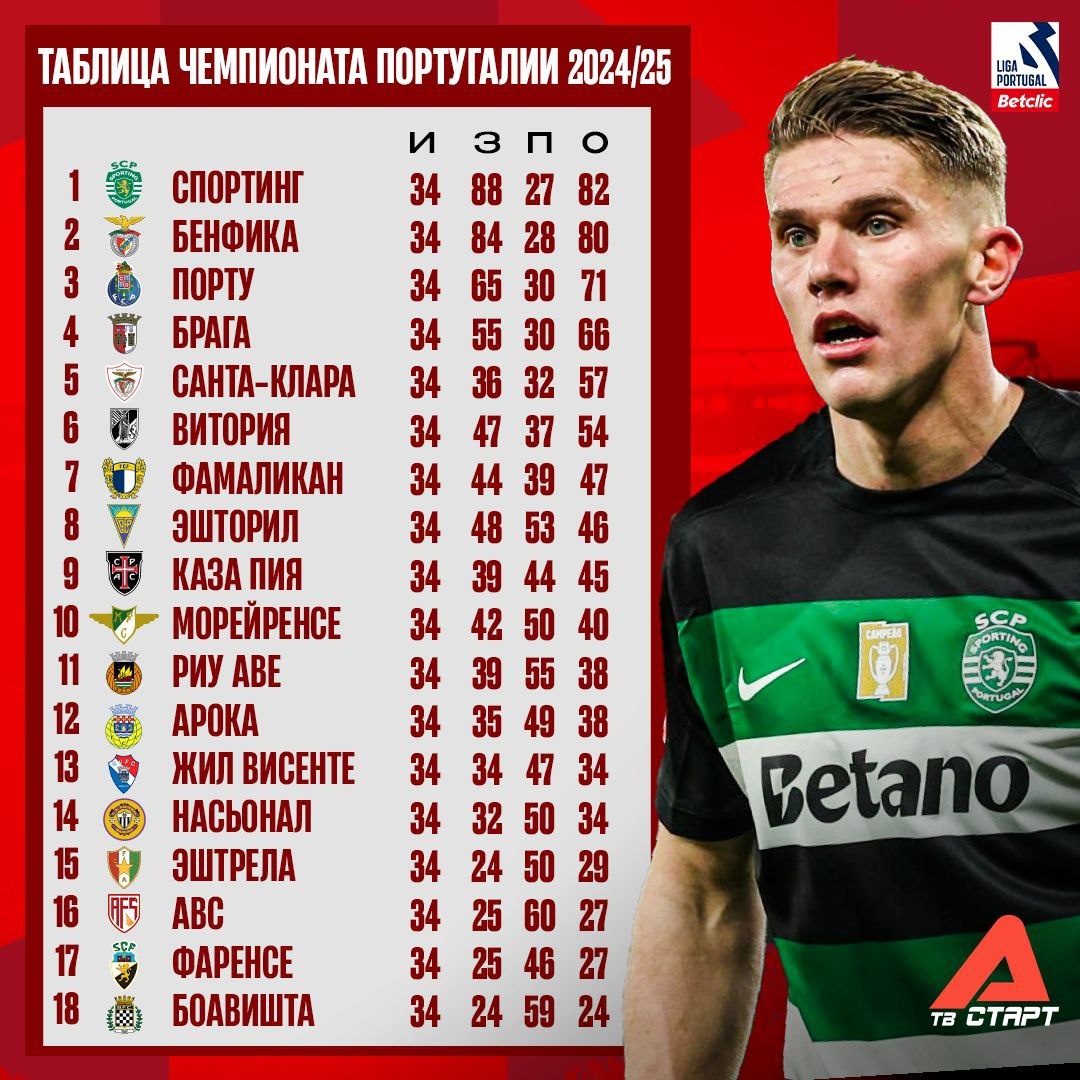 📜🔎 Подводим итоги сезона Примейры Первая четверка такая же, как и в прошлом сезоне. «Спортинг» и «Бенфика» идут в Лигу Чемпионов, «Порту» и «Брага» в Лигу Европы. А вот «Виторию» из пятёрки выбил дерзкий новичок Примейры 2024/25 – «Санта-Клара». «Островитяне» отправляются в Лигу Конференций. Борьба за выживание получилась максимально плотной. АВС спасся лишь по дополнительным показателям, команда Гильермо Очоа ушла в «стыки» с «Визелой». «Фаренсе» и «Боавишта» Виталия Лысцова вылетели в Сегунду. Спасибо, что смотрели этот сезон вместе с нами на телеканалах «Старт» и платформе TVSTART.RU 🖥 🛒 Наше приложение в Google Play (вне РФ) 💙 Наше приложение в RuStore (для РФ) 🛒 Наше приложение в App Store