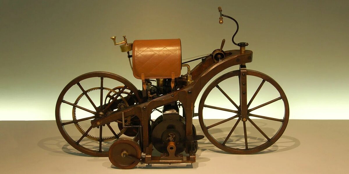 Первый в мире мотоцикл — это Daimler Petroleum Reitwagen керосиновая повозка для верховой езды Даймлера в переводе с немецкого. Его запатентовал инженер Готтлиб Даймлер 29 августа 1885 года К 100-летию первого запатентованного мотоцикла Daimler Petroleum Reitwagen, в 1985 году, было изготовлено 10 его копий Оригинальный экземпляр был уничтожен во время пожара в Каннштатте в 1903 году, но несколько копий находятся в коллекциях музея, в том числе Немецкого музея в Мюнхене, Зала коллекций Honda на заводе Twin Ring Motegi в Японии, Зала славы мотоциклов AMA в Огайо, выставки мотоциклов Deeley в Ванкувере (Канада) и в Мельбурне (Австралия). Также точная копия Daimler Petroleum Reitwagen есть в коллекции Mercedes-Benz-Museum в Штутгарте Максимальная скорость мотоцикла Daimler Petroleum Reitwagen составляла 11 км/ч. Масса мотоцикла составлял 90 кг. Длина мотоцикла Daimler Petroleum Reitwagen — 1680 мм, а высота —1040мм Некоторые детали мотоцикла Daimler Petroleum Reitwagen: 17-летний сын