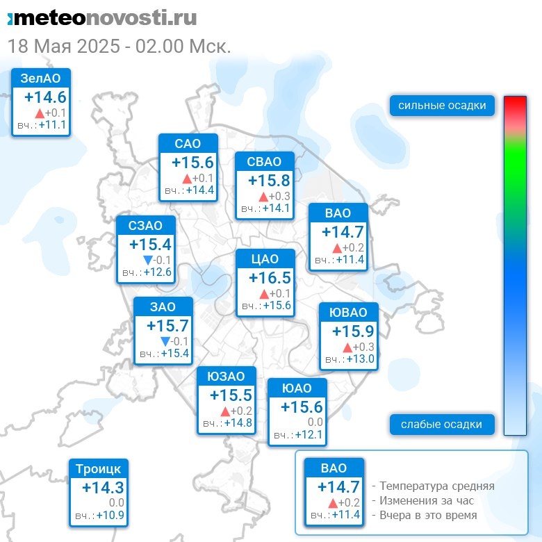В 2:00 в Москве было от +13.5°C до +16.8°C, средняя температура +15.5°C #погода #Москва #весна #температура #18мая #воскресенье