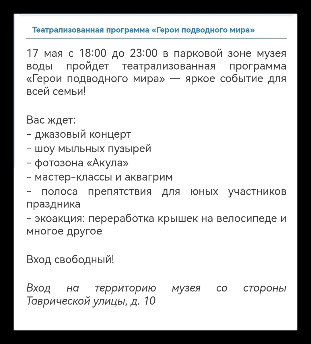 Изначально планов на эту субботу у меня не было. Но в какой-то группе а-ля "Питер с детьми" или что-то вроде того я увидела объявление, что во дворе музея "Вселенная воды" будет программа для детей. К тому же бесплатная.