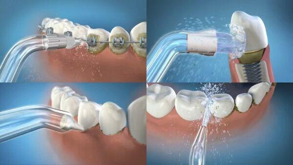 Ирригатор — это устройство, которое с помощью направленной струи воды под давлением вымывает остатки пищи, мягкий налёт и бактерии. Он особенно полезен тем, у кого:
