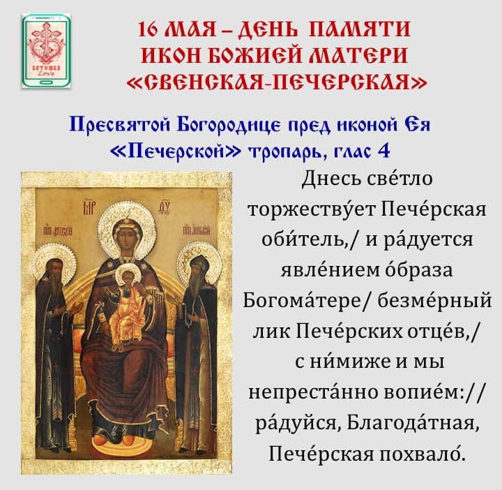 Икона написана прп Алипием Печерским. На иконе Божия Матерь сидит на престоле, на коленях у Нее Богомладенец. Справа - прп Феодосий, слева – прп Антоний Печерские. Пребывая в Киево-Печерском монастыре, прославилась чудесами, в 1288 г по р Десне перенесена в Брянский Свенский монастырь . Во время плавания лодка пристала к правому берегу реки Свены. Утром в лодке икону не нашли, а увидели на горе против р Свены. Икона стояла на дубе между ветвями. Дерево позже срубили и употребили на доски для икон. На этом основали храм в честь Успения Пресвятой Богородицы. Икона прославилась исцелениями слепых, бесноватых, заступничеством от врагов. Когда Брянск оказался под угрозой наполеоновских войск, жители совершили крестный ход, неся на руках икону и вознося молитвы Заступнице. Враг обошел город стороной. После революции обитель разрушили, а икону спас знаменитый искусствовед Николай Николаевич Померанцев и привез в Москву После реставрации икона помещена в Третьяковскую галерею, где