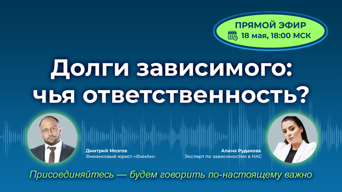 Ваш близкий в долгах из-за зависимости, а коллекторы звонят вам? Вы не обязаны расплачиваться за чужие ошибки — но как защитить себя по закону? Сегодня на бесплатном вебинаре разберем⬇️ 🔹 Чьи долги можно списать через банкротство? 🔹 Как не стать финансовой жертвой чужой зависимости? 🔹 Пошаговый алгоритм действий для родственников. 📅 18 мая | ⏰ 18.00 по МСК 📍Онлайн, бесплатно ➡️Регистрируйтесь: https://t.me/alinarudakova_nas Ваше финансовое спокойствие — в ваших руках!