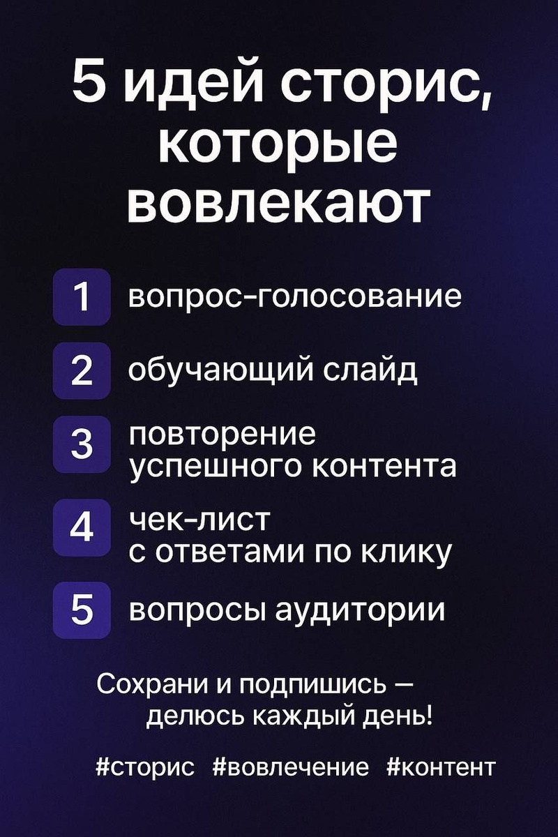 Сторисы, которые не сливают аудиторию: 5 форматов без воды. Если ваши сторис — это скучные селфи и скрины, вы теряете деньги. Ловите рабочие схемы для взрывного вовлечения: 1. Вопрос-голосование → Ловим мнения. — «Котики или печеньки?» — простые опросы цепляют даже пассивных подписчиков. 2. Обучающий слайд → Прокачиваем экспертность. — 1 слайд = 1 факт. Например: «Как собрать сторис за 30 секунд». 3. Повтор успешного поста → Нажимаем на большие. — Репостите топовый контент из канала. Люди любят повторение — проверено. 4. Чек-лист с кнопкой → Продаём без продаж. — «5 ошибок в сторис» → «Скачать гайд» → Profit! 5. Прямой вопрос → Разрываем тишину. — «Что вас бесит в маркетологах?» — провоцируем на комментарии. 👉 Запомните: Сторисы — это не «надо постить», а инструмент. Если делать их по шаблону — аудитория сама начнёт писать вам. Подписывайтесь, если хотите контент, который работает, а не «красиво лежит». В канале уже ждут: гайды, кейсы и никакого бубна! #контент #сторис #вовле