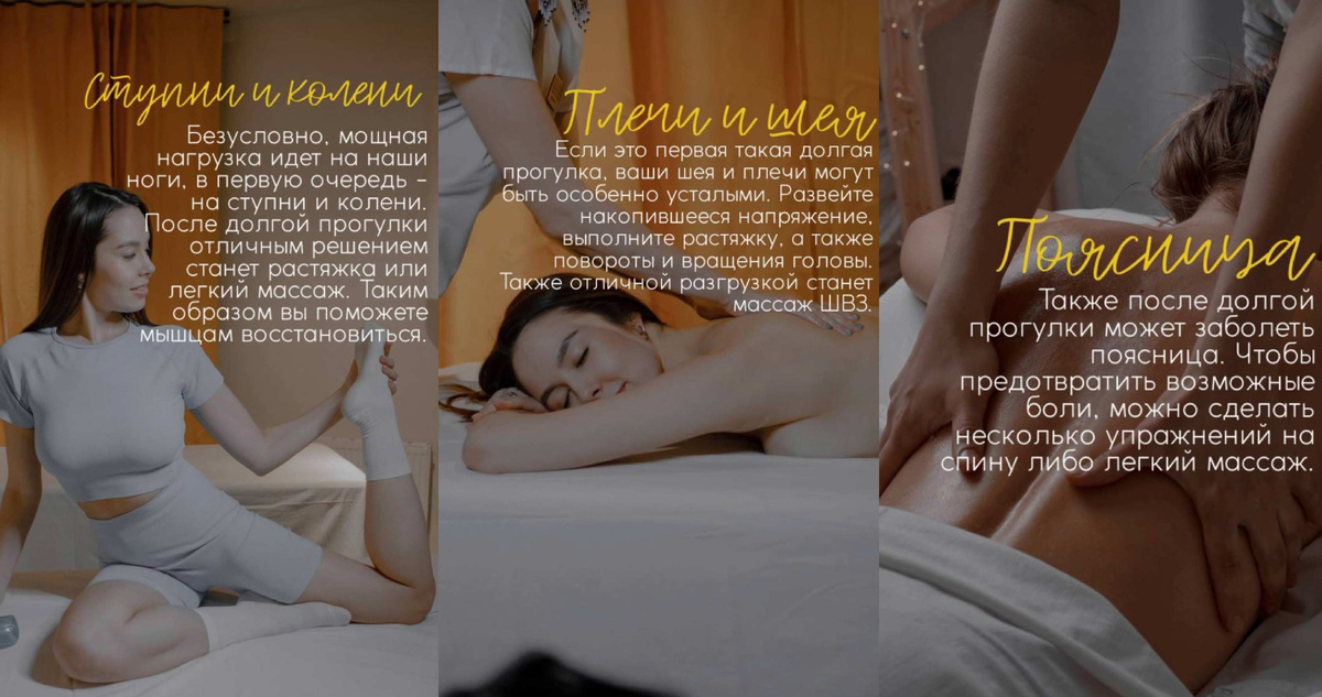 Ступни и колени. Безусловно, мощная нагрузка идет на наши ноги, в первую очередь на ступни и колени После долгой прогулки отличным решением станет растяжка или легкий массаж. Таким образом Вы поможете мышцам восстановиться. Плечи и шея. Если это первая такая долгая прогулка, Ваши шея и плечи могут быть особенно усталыми. Развейте накопившееся напряжение, выполните растяжку, а также повороты и вращения головы. Также отличной разгрузкой станет массаж ШВЗ. Поясница. Также после долгой прогулки может заболеть поясница. Чтобы предотвратить возможные боли, можно сделать несколько упражнений на спину, либо легкий массаж. Не забывайте, что забота о вашем теле - это не только важный аспект здорового образа жизни, но и приятный ритуал. Помните, что после длительной прогулки всегда нужно давать телу время на отдых и восстановление, а посещение спа-салона «Рельсы-Рельсы» это не только отдых, но еще и польза. Тело точно скажет Вам спасибо! САМОЕ ТЕПЛОЕ ВРЕМЯ уже началось. Приходите в спа Рельсы за