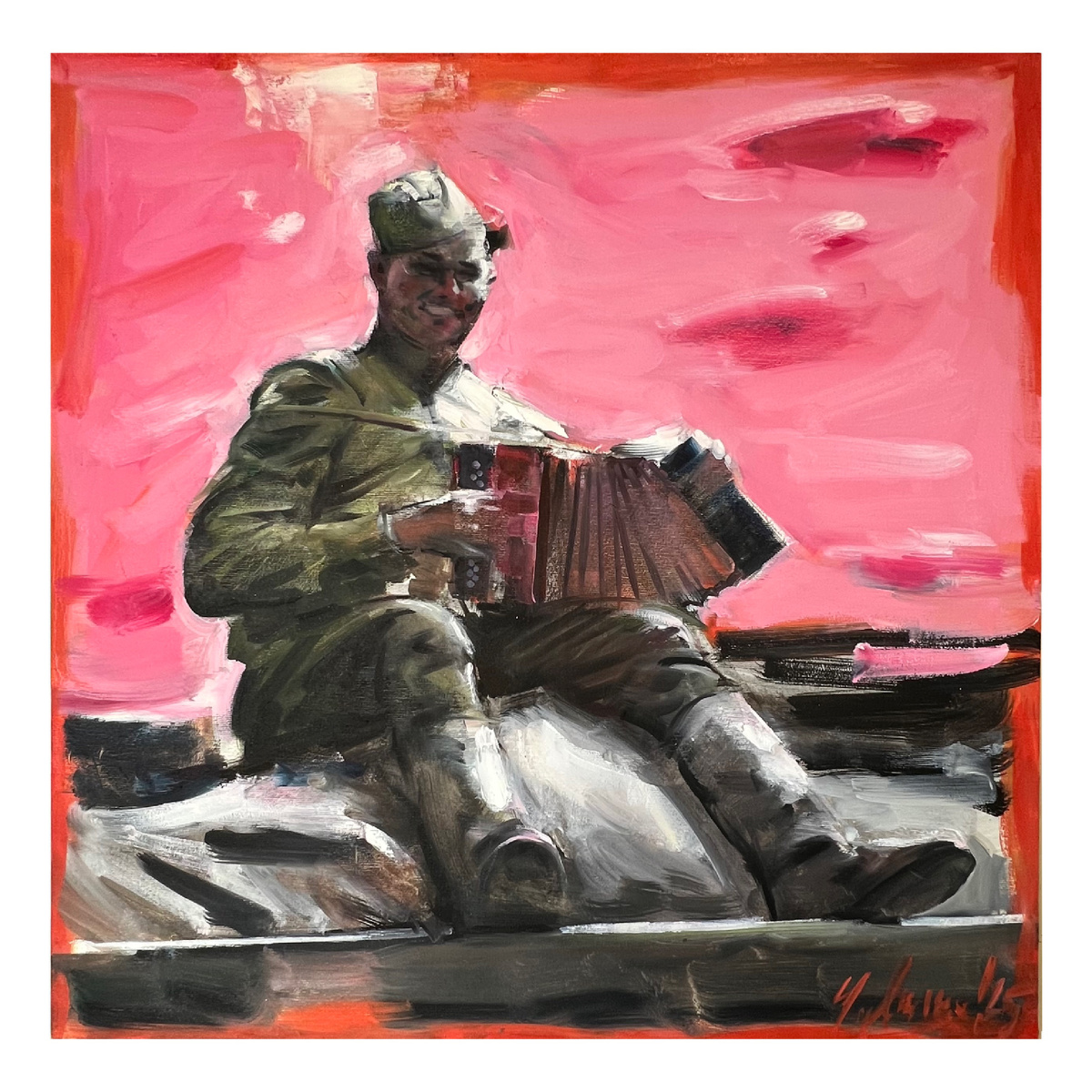 Новая серия Александра Чувашева «Цвет победы» представляет собой галерею портретных образов героев Великой отечественной войны. Она сочетает в себе и фотореализм, и импрессионизм с элементами абстракции. «Цвет победы» одновременно очень органичная, но и очень неожиданная серия в творчестве художника. Давайте же начнем изучать экспозицию прямо сейчас. ••• Гармонист серия Цвет Победы 80х80 холст/масло 2025 ••• Серия «Цвет Войны» представляет собой живописное исследование фотографий или фотографических по своей структуре образов времен Великой Отечественной войны. Некоторые фотографии довольно известны, а некоторые прообразы зритель может не знать. Однако общая эстетика считывается моментально. Это создает особый эффект — незнакомое выглядит знакомым, а знакомое выглядит по-новому. Так, работа «Гармонист» посвящена типичному сюжету фронтового отдыха. Яркий монолитный фон делает фигуру героя абстрактной, но контрастные акценты бликов однозначно передают радостное настроение. Цветовое реше