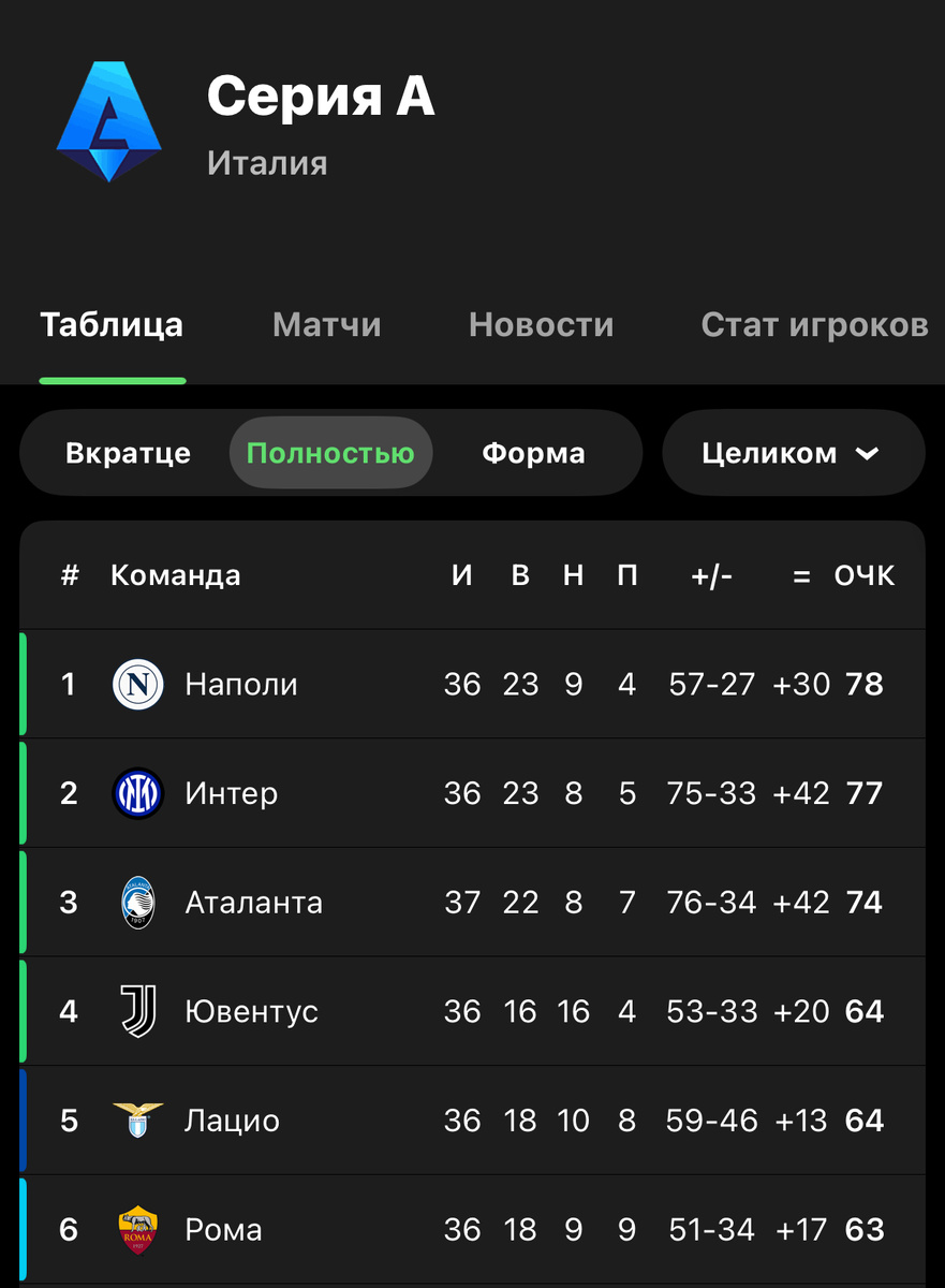 На финише сезона Серии А разгорается нешуточная борьба за Скудетто! 🔥 “Наполи” оступился, “Интер” дышит в спину – отрыв всего одно очко за два тура до конца! 🤯 Но если вы думаете, что в случае равенства очков чемпион определится по разнице забитых и пропущенных мячей, то вы глубоко ошибаетесь! ❌ В Италии все гораздо интереснее! 😉 “Золотой матч” – последний шанс для претендентов! 🥇 В преддверии прошлого сезона в итальянском футболе произошла революция! 🔄 Была проведена реформа, согласно которой победитель в случае равенства очков между двумя лидерами определяется в “золотом матче”! 🤩 Это значит, что в случае равного количества набранных очков про разницу забитых и пропущенных, результаты очных встреч и прочие дополнительные показатели забывают! 🙅♂️ Два клуба, разделившие вершину турнирной таблицы, встречаются в решающем поединке на нейтральном поле! 🏟️ Серия пенальти без дополнительного времени! 🎯 Правила “золотого матча” просты и беспощадны: в случае ничьей в основное время