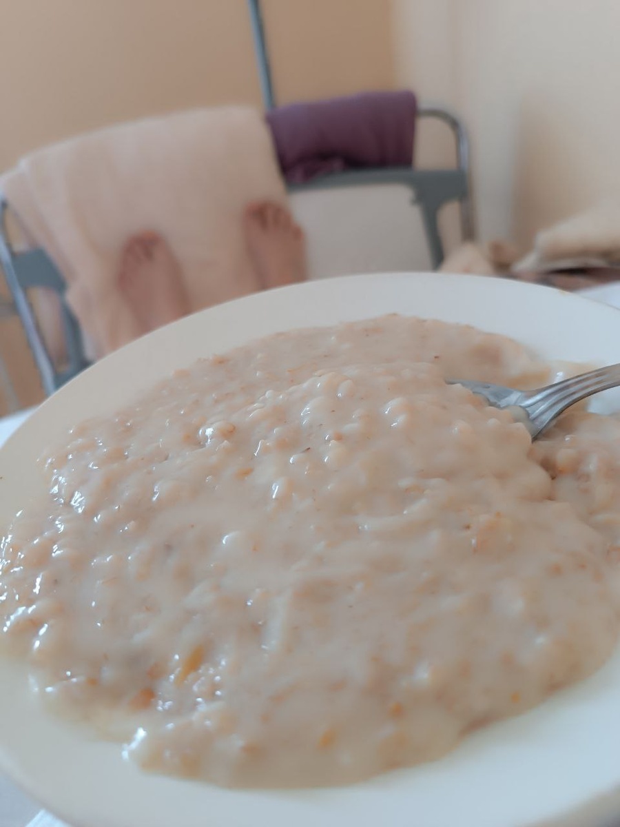 Отвратительней овсяной каши я ещё не ела, но она была очень долгожданной. Завтрак : каша геркулесовая и резиновое варёное яйцо, именно резиновое я бы так не сварила. Из напитков кофе больничный 3 в 1, пить это месиво нельзя , нюхать тоже, на вкус как нефть( я не знаю какая нефть на вкус, но в моем представлении это одно и то же) Вспоминаю 2021, на завтрак давали бананы и бутерброды с красной рыбкой....