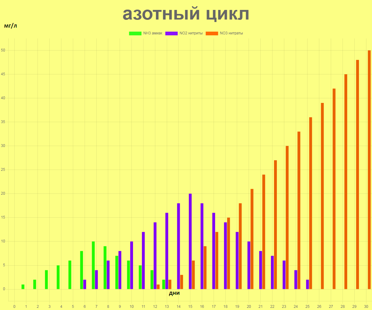 Этот график показывает, как проходит азотный цикл, но период его у каждого свой, в зависимости от таких факторов, как фильтрация, биозагрузка, толщина грунта, плотность посадки растений. Контролировать азотный цикл нужно с помощью капельных тестов. Более подробно в статье «Всё об азотном цикле».