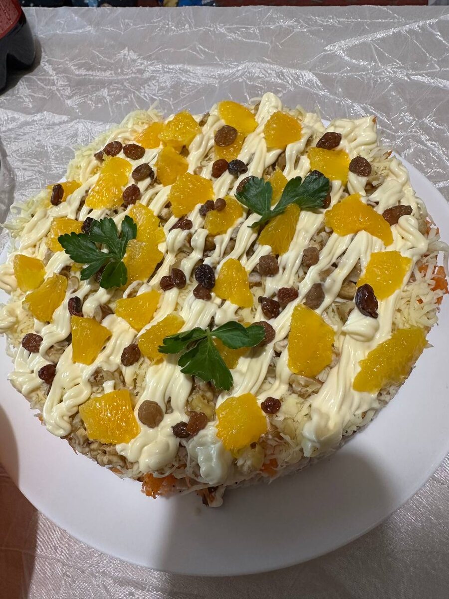 Состав: Последовательно слои 1) Отварная курица - 2 шт филе. Можно использовать отварные бедра, они нежнее. Копченую курицу не рекомендую, она своим запахом забьёт все; 2)Лук маринованный - 1шт.; 3) Сетка из майонеза; 4)Изюм и 50 гр. ( залить кипятком предварительно); 5) Свежая морковь на мелкой тёрке- 1 шт.; 6) Сетка из майонеза; 7) Грецкие орехи - 50 гр. 8) Слой любого твёрдого сыра на мелкой тёрке - 100-150 гр.; 9) Сетка из майонеза; 10) Кусочки апельсина без перегородок. Чем больше тем вкуснее на мой взгляд; 11) Чуть украсить изюмом, можно и ядрами граната. Салат получается очень оригинальным, лёгким хоть и с майонезом. Теперь это мой фаворит. На столе он улетит первым. Пробуйте приготовить и не пожалеете!