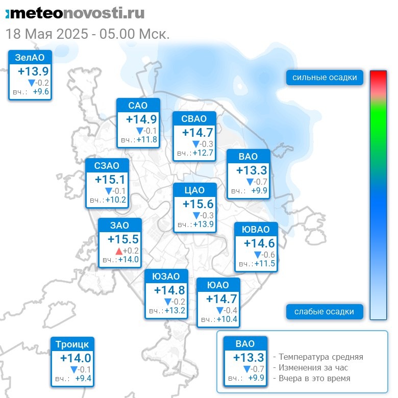 В 5:00 в Москве было от +12.4°C до +16°C, средняя температура +14.7°C #погода #Москва #весна #температура #18мая #воскресенье