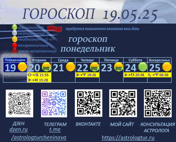 Этот день может принести свежие идеи, разного рода неожиданности, или подтолкнуть нас к спонтанным решениям. В течение всего дня возможны напряженные моменты. Мы можем испытывать давление со стороны, или наше желание действовать может столкнуться с ограничениями. Также возможны сомнения в собственных решениях, беспокойство из-за незавершённого дела, желание действовать импульсивно, несмотря на обстоятельства, или эмоциональная усталость. Тем не менее, до 12 часов (мск) есть хороший шанс получить желаемое, отстоять свои позиции. Некоторым из нас день принесёт более гармоничные оттенки. Уже сегодня они почувствуют влияние благоприятных аспектов - Солнца с Сатурном и/или Венеры с Марсом (о влиянии аспектов читайте ниже). Что поможет принимать взвешенные решения, продвигаться вперёд без лишнего стресса, а также будет способствовать гармонии в отношениях. Основные аспекты, которые будут на нас влиять на этой неделе, гармоничные. Влияние каждого аспекта держится несколько дней. Поэтому,
