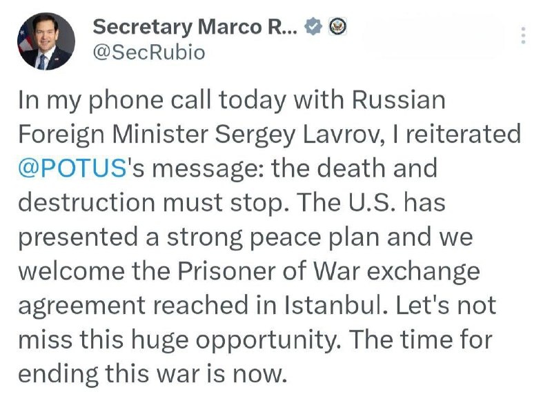 США представили сильный мирный план, и мы приветствуем соглашение об обмене военнопленными, достигнутое в Стамбуле. Давайте не упустим эту огромную возможность. Настало время положить конец этой войне».
