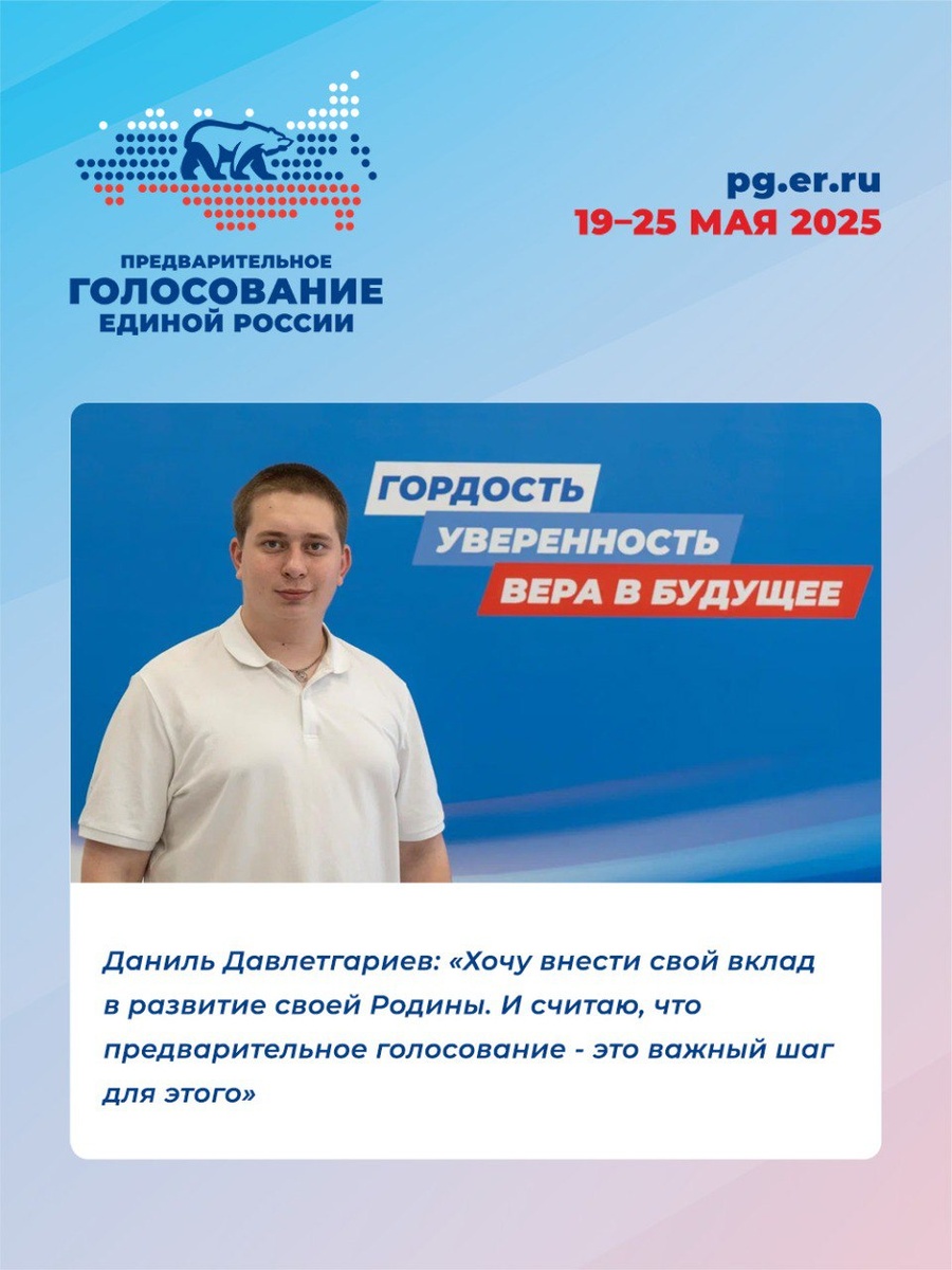 Совсем скоро начнётся предварительное голосование. Узнайте больше о тех, кто пробует свои силы в политике и участвует в нем. Даниль Давлетгариев - заместитель руководителя Оренбургского регионального отделения Всероссийской общественной организации «Молодая Гвардия Единой России», руководитель Оренбургского городского отделения Оренбургского регионального отделения Всероссийской общественной организации «Молодая Гвардия Единой России». Во время паводка работал на эвакуации людей из затопленной территории, а также на пункте приема и выдачи гуманитарной помощи. Посещал новые регионы с гуманитарной миссией, восстанавливал дома, помогал в госпитале.