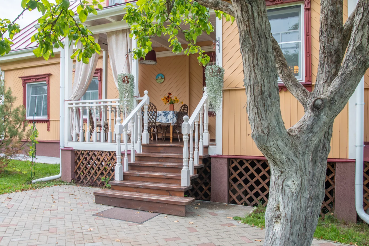 В деревне Бёхово на берегу Оки стоит дом с мезонином, в котором, кажется, живёт сама идея русской дачи. Окна смотрят на воду и церковь, на веранде шумит самовар, внутри — абажуры, вышитые подушки и книжные полки, полные наследства. Это не музей и не стилизация: тут действительно так живут. Дом построен в 1956 году. Когда-то здесь звучал рояль, на стенах висели картины, а потом он надолго остался без хозяев. Семья Шумаковых купила его в 2017 году: переехав из Москвы в Тульскую область, они искали место, где можно принимать гостей. Так появился гостевой дом "Усадьба Бёхово" — проект без пафоса, но с характером. На восстановление ушло два года. Дом требовал не косметики, а капитального вмешательства: в некоторых комнатах провалились полы, старая печь разрушилась, и многие мастера убеждали, что проще снести дом и построить заново. Но Шумаковы настояли — они хотели сохранить подлинную структуру. Главный вопрос: можно ли спасти старые брёвна? Ответ искали у нескольких бригад, и в итоге решил