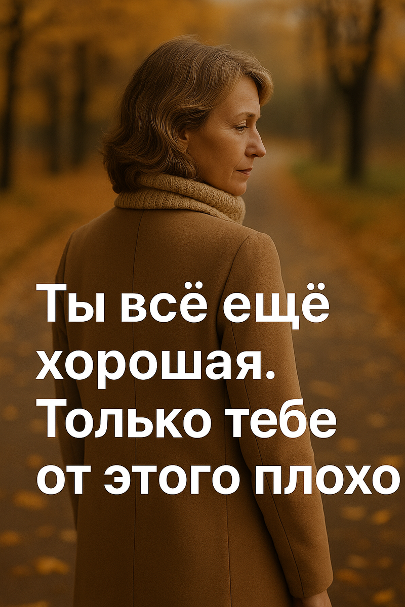Ты добрая. Ты терпеливая. Ты никому не навязываешься. Ты стараешься никого не обидеть. Ты всегда сначала подумаешь, как другим, а потом — может быть — о себе. Ты та, про кого говорят: «золотой человек». А внутри — ком. Тревога. Усталость, которую ничем не выспишь. И ощущение, что ты медленно, но точно сгораешь. Я хочу, чтобы ты услышала: ты хорошая. Но тебе от этого хреново. Почему? Потому что ты — не ты. Ты — образ. Роль. Надстройка над живым телом. Ты прожила десятки лет, поддерживая всех, кроме себя. Ты научилась быть удобной. Бесконечно. Системно. Почти автоматически. Тебя хвалили за то, что ты не конфликтуешь. Ты сама собой гордилась, когда сглатывала. Ты училась понимать других. А себя — прощать за то, что злишься. Ты воспитала в себе дипломата, миротворца и круглосуточную службу поддержки. А теперь лежишь вечером с глазами в потолок — и не понимаешь, почему тревога. Почему хочется исчезнуть. Синдром хорошей девочки? Да, чёрт возьми. Тольк