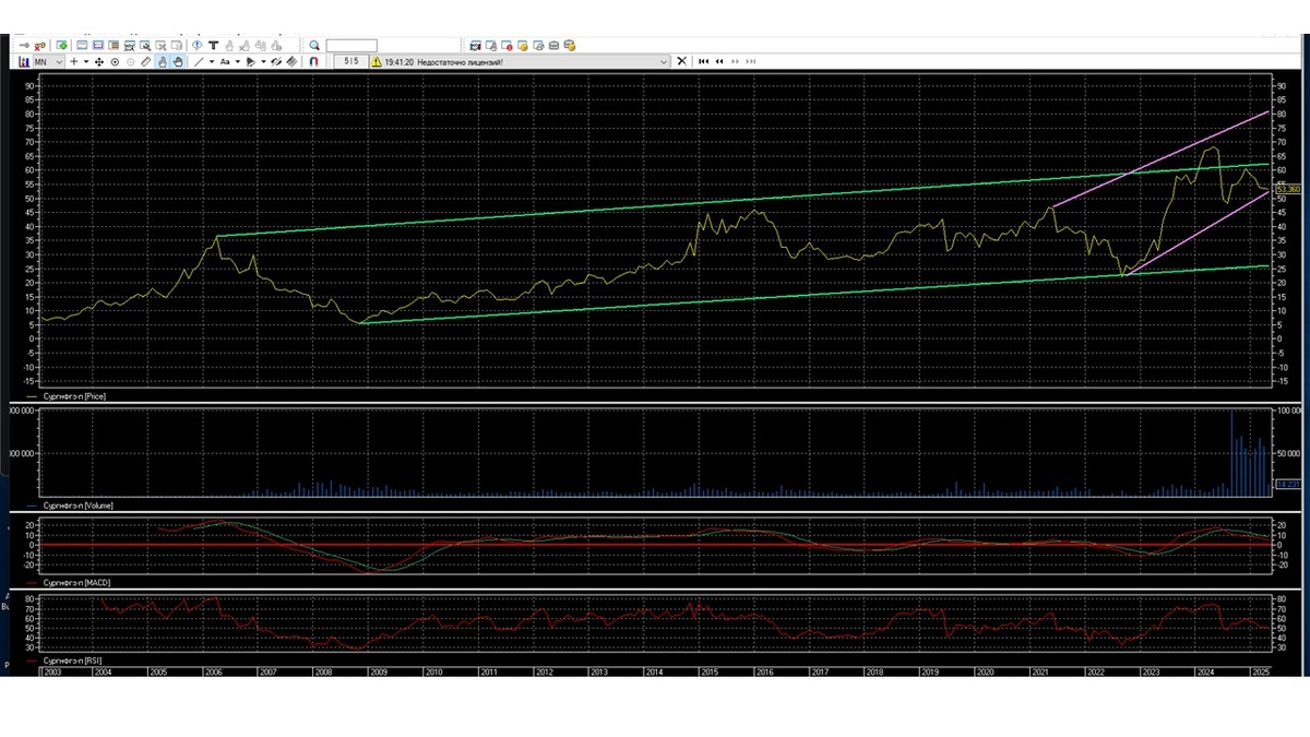 Новостной фон ухудшается, компания Сургутнефтегаз сообщила, что акционерное собрание переносится на осень. Дивиденды за 2024 год выплачиваться не будут, потому что компания имеет финансовые трудности, хотя имеет финансовую подушку. Центральный банк РФ ставку понижать не будет до конца года, акция до конца мая скатывается за уровень 52. К середине июня акция находится на уровне 50, к концу июня закрепляется под уровнем 50 и начинает двигаться в сторону уровня 45.