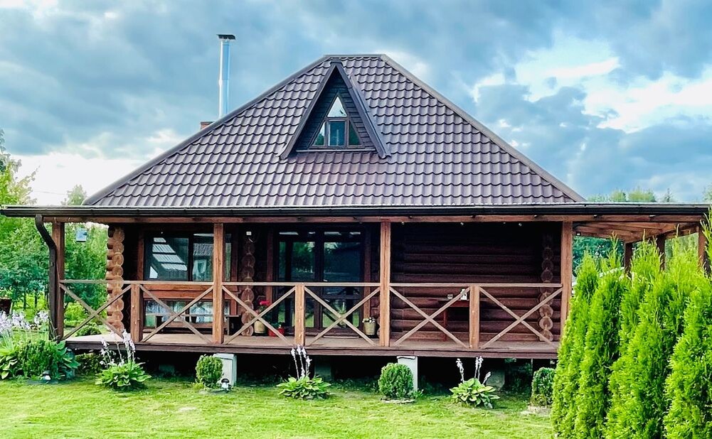 Здесь продается современный деревянный дом в стиле шале. Сруб у него из бревен большого сечения – 28-30 см. Построен в 2019 году.