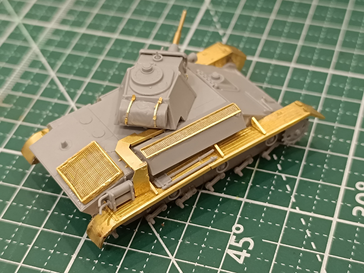 Наконец сборка завершена и можно переходить к окраске. Мне очень понравилось работать с фототравлением. Есть своя эстетика в неокрашенной модели с золотистыми акцентами латунных деталей. Коротко расскажу о финальных этапах сборки Самая сложная деталь - кожух выхлопа Базово этой детали в коробке нет, она дополняет модель, а не заменяет существующие детали. А ещё выглядит лучше, чем двухсоставные выхлопные трубы Дальше перехожу к сборке башни Сборка башни начинается с держателя маски, казённой части орудия, пулемёта и, если не ошибаюсь, прицельных приспособлений. Всё это при закрытом люке башни становится "сусликом". Далее срезаю штатно отлитые крюки - их заменят латунные детали, устанавливаю боковые детали башни и казённую часть орудия После - приклеиваю маску. Точеный ствол - становится очевидно, что глубины отверстия в маске недостаточно. Вооружаюсь сверлилкой и рассверливаю отверстие. После устанавливаю на место ствол и примеряю башню Осталось совсем немного! Устанавливаю на мес