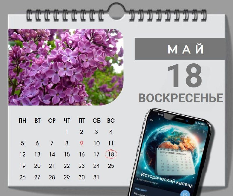📌 Памятные даты: ● День памяти жертв депортации народов Крыма ● Всемирный день памяти жертв СПИДа 📌 Праздники: ● Международный день музеев🏛 ● День Балтийского флота ВМФ России ● День дворника 🧹 ● Мeждунapoдный дeнь cиpeни ● День рождения майского жука🪲 ● Дeнь вcтpeчи c пpeкpacным ● День без грязной посуды 🍽🧽 ● Вceмиpный дeнь выпeчки 🥐 ● День мачехи ● День отправки электронной поздравительной открытки ● День Розовой Пантеры ● День хлыстальщиков 📅 Исторический календарь #18мая #праздники