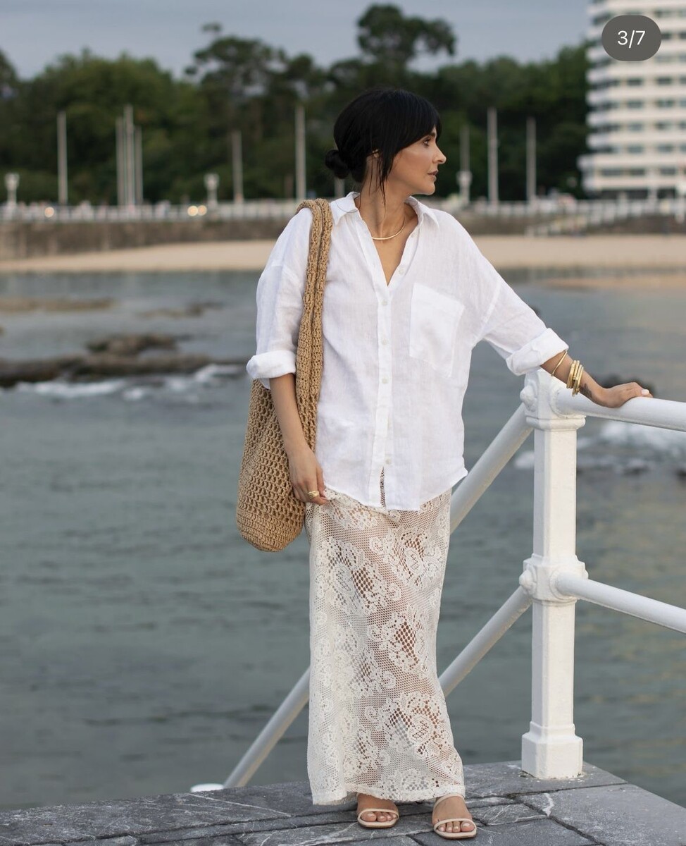 1. Стильный образ из кружевной юбки с хлопковой рубашкой или рубашкой-жакетом.