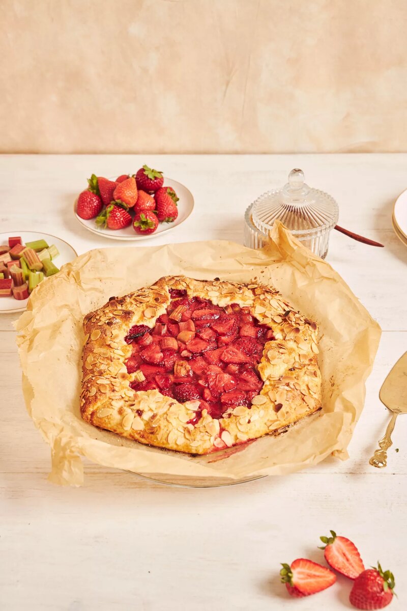 Это открытый итальянский пирог с тонким песочным тестом и сочной начинкой. В этом варианте — с творожным сыром и свежей клубникой. Идеален для летнего чаепития или лёгкого десерта к ужину.