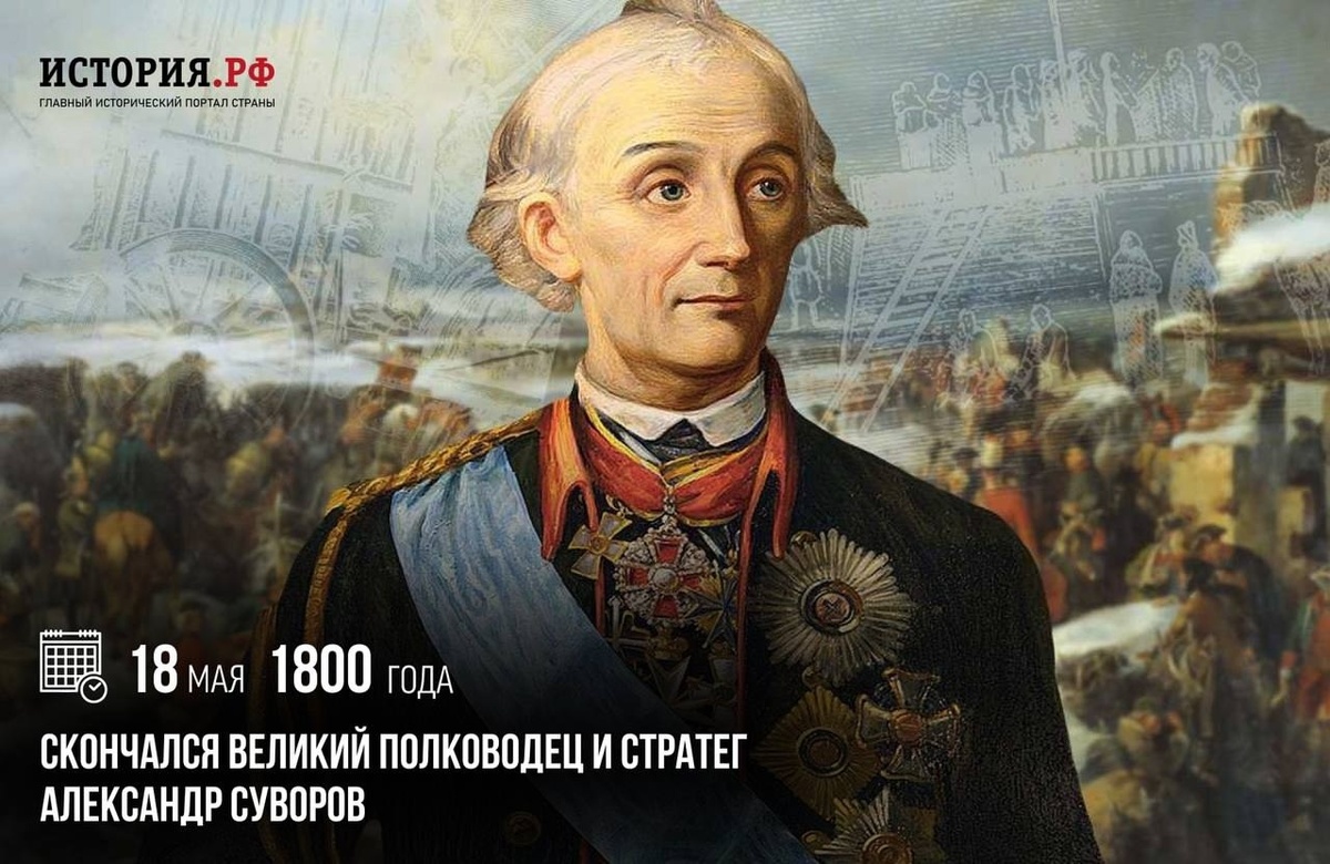 18 мая 1800г. Скончался великий русский полководец и стратег Александр Васильевич Суворов. Он стал не только самым знаменитым военачальником в российской военной истории, но и одним из самых известных полководцев в мире. Замечательный стратег, превосходный тактик, Александр Васильевич был одновременно и мудрым военным наставником. Он воспитал первоклассные кадры высших офицеров русской армии #ПамятныеДатыВоеннойИсторииОтечества #ДеньВИстории #ГодЗащитникаОтечества #80ЛетВеликойПобеды Источник: https://vk.com/wall-216215303_1872 Подпишитесь на наши группы ВКонтакте и в Одноклассниках - читайте, смотрите и комментируйте! Источник