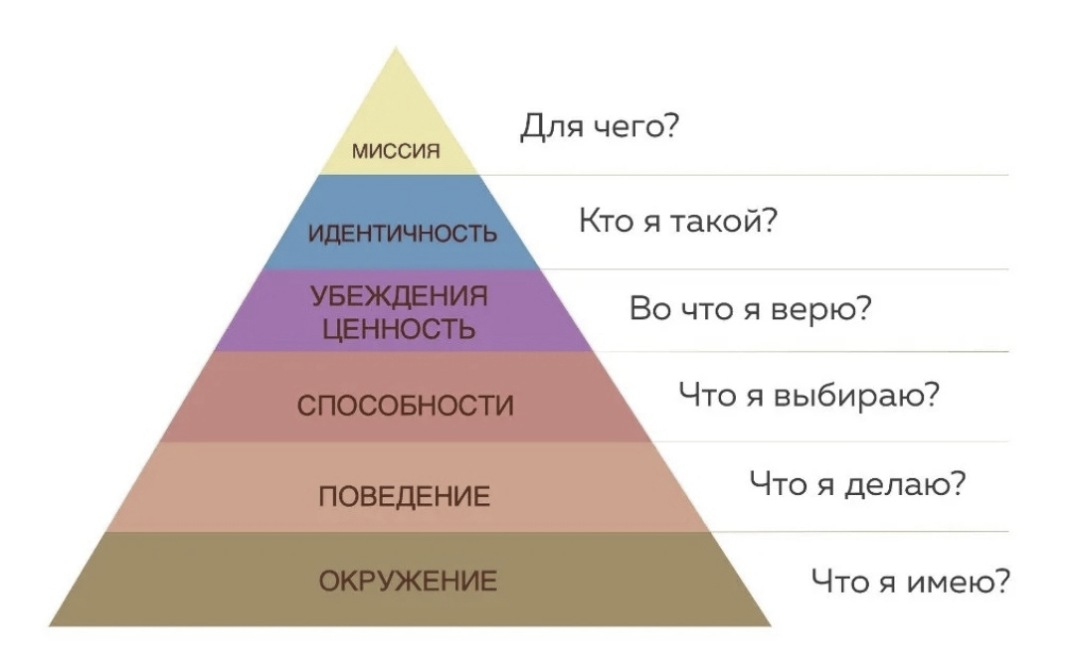 Пирамида Роберта Дилтса включает в себя логические уровни, где каждый нижестоящий зависит от вышестоящего. Она показывает, что решение проблемы всегда находится на один-два уровня выше самой проблемы.