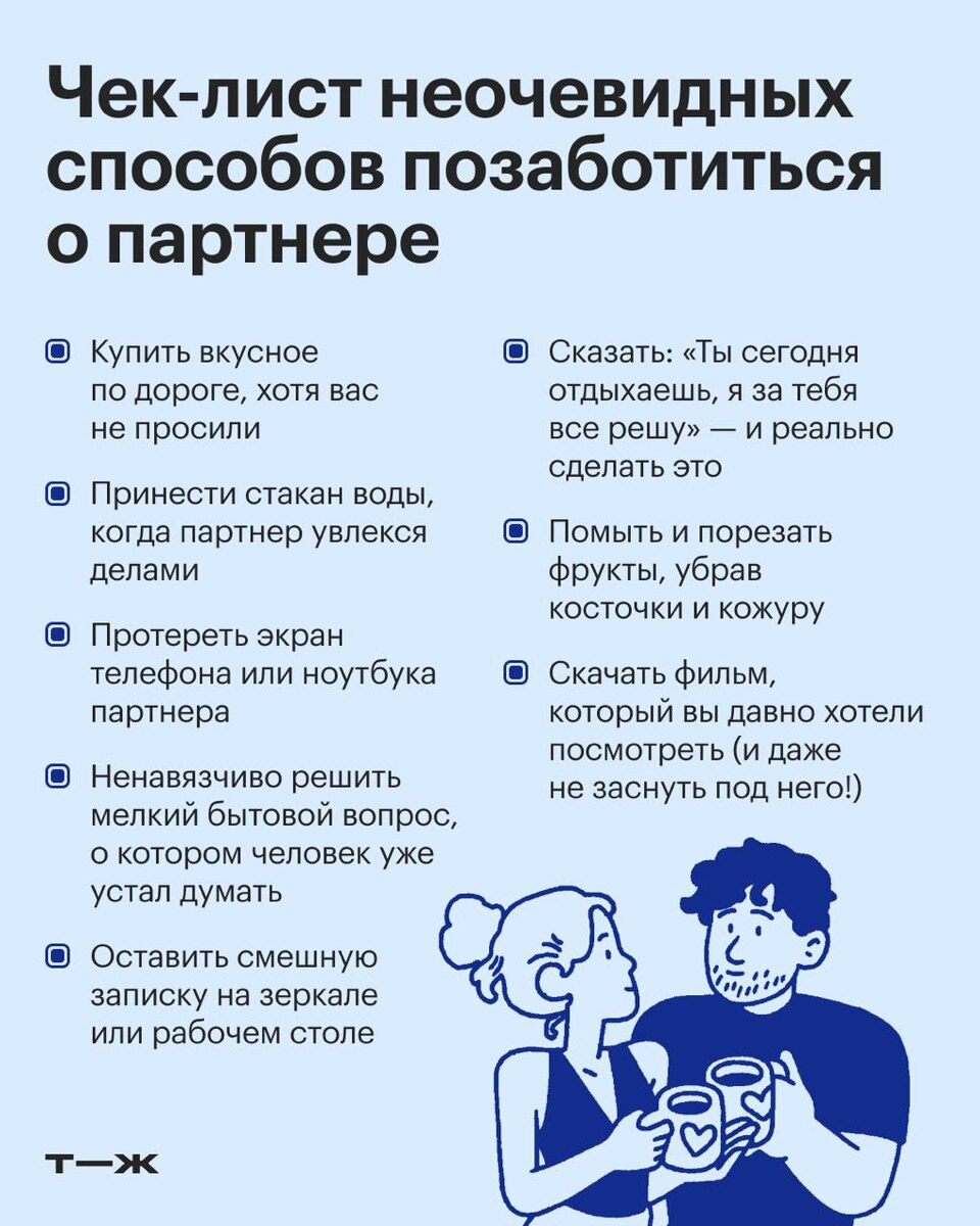❤️🔥 Челлендж: честно изучаем и улучшаем свои отношения. День 5 Как вы проявляете заботу в паре? Кормите, обнимаете, напоминаете надеть шапку? Замечает ли это ваш партнер? Как вы считаете, что из ваших стараний ценится, а что уходит в слепую зону? Поделитесь своими наблюдениями здесь: https://t-j.ru/m-tg/challenge-refleksiya-relationships-5/ #челлендж_отношения
