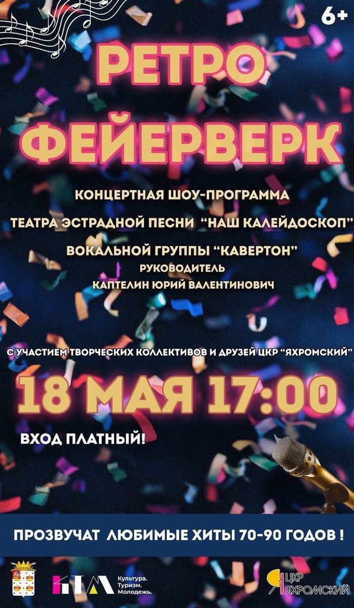‼️Уже сегодня‼️ ✨ 18 мая в 17 часов в Центре культурного развития "Яхромский" состоится концертная шоу-программа театра эстрадной песни «Наш калейдоскоп» вокальной группы «Кавертон» , руководитель Юрий Валентинович Каптелин. Вас ждут: 🌟 Живые выступления с легендарными хитами прошлых десятилетий! 🌟 Зажигательные мелодии! 🌟 Трогательные истории, которые заставят вас вспомнить самые яркие моменты юности! 🌟 Море позитива и незабываемых эмоций! Погрузитесь в атмосферу 70–90-х годов и насладитесь звучанием хитов того времени. 💰Вход платный! Билеты можно приобрести по ссылке https://new.biletof.com/action/?frame=1&ra=16135&action=9469&place=338.. или в кассе Центра за наличные деньги. 📅 18 мая 🕖 17:00 ЦКР "Яхромский" ул. Заречная д.2 От Валентины Вершининой