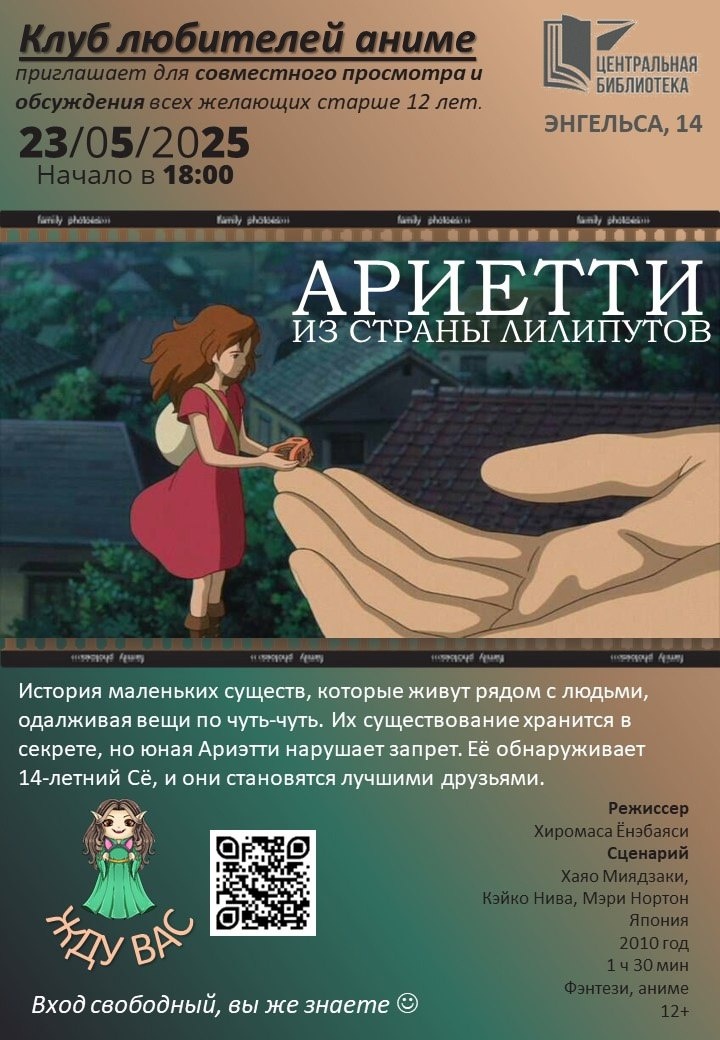 📽Клуб любителей аниме приглашает для совместного просмотра и обсуждения всех желающих старше 12 лет 23 мая в 18:00 в Центральную библиотеку Обнинска. «Ариэтти из страны лилипутов» (автор сценария — Хаяо Миядзаки, режиссёр — Хиромаса Ёнэбаяси, 2010). История маленьких существ, которые живут рядом с людьми, одалживая вещи по чуть-чуть. Их существование хранится в секрете, но юная Ариэтти нарушает запрет. Её обнаруживает 14-летний СЁ, и они становятся лучшими друзьями. Вход свободный. Обнинск, ул. Энгельса, 14. 👍 Подписаться | Прислать мероприятие
