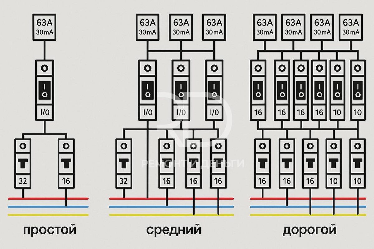 ⚡️ 🔹🔹🔹 🔹🔹🔹🔹🔹🔹🔹 🔹🔹🔹 Как правильно выбрать автоматы и УЗО для квартиры — от простого до продвинутого варианта Грамотно собранный щиток — это не только порядок и безопасность, но и спокойствие на годы вперёд. А вот от того, как вы подберёте автоматы и УЗО, зависит стабильность работы всей электросистемы: от духовки до кондиционера. Сегодня расскажем, как спроектировать защиту электрощитка под вашу квартиру — на понятных примерах. 🔹 Вариант 1: простой и бюджетный Идеально подойдёт для однокомнатной или небольшой двухкомнатной квартиры, особенно если делаете ремонт под аренду. Включает 6 групп: 🔹Электроплита 🔹Розетки по зонам (кухня, спальня, санузел и т.д.) 🔹Освещение 🔹Проточный водонагреватель 📈 Защита: 🔹Ввод с УЗО 30 мА на 63 А 🔹Автоматы: плита и водонагреватель — по 32 А, розетки — 16 А, свет — 10 А 💰 Преимущества: 🔹Экономия на кабеле и монтаже 🔹Стоимость — от 7–8 тыс. руб. 🔹Минусы: 🔹Меньше контроль за утечками 🔹Сложнее локализовать неисправност