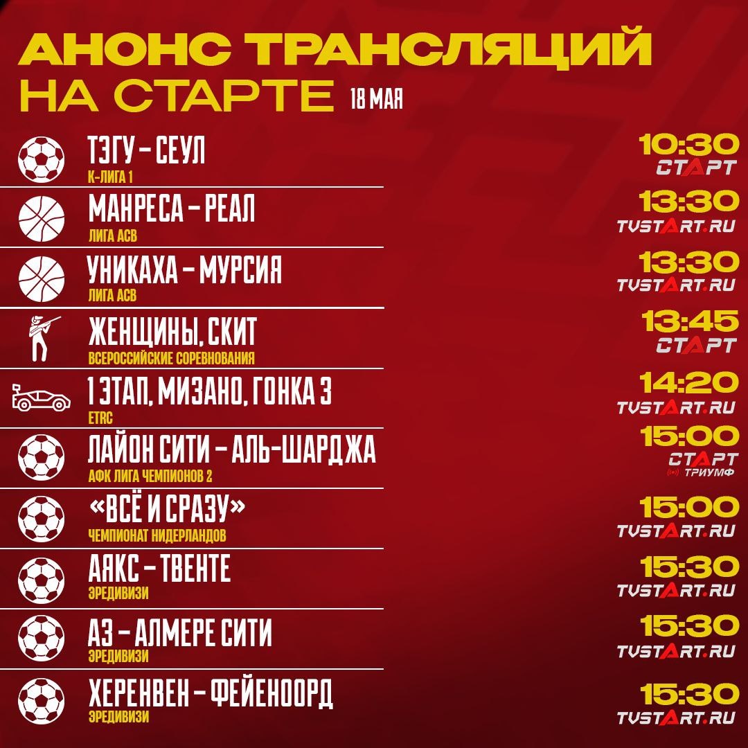 🍿📺 День финалов на TVSTART.RU! Два прямых, в АФК Лига Чемпионов 2 и волейбольной Лиге Чемпионов, а также несколько косвенных в Эредивизи – сегодня станет известен чемпион. Ещё в нашем эфире К-Лига 1, стендовая стрельба, австрийская Бундеслига, Лига АСВ, немецкий гандбол и баскетбол. Проведите воскресенье на платформе TVSTART.RU 🖥 🛒 Наше приложение в Google Play (вне РФ) 💙 Наше приложение в RuStore (для РФ) 🛒 Наше приложение в App Store