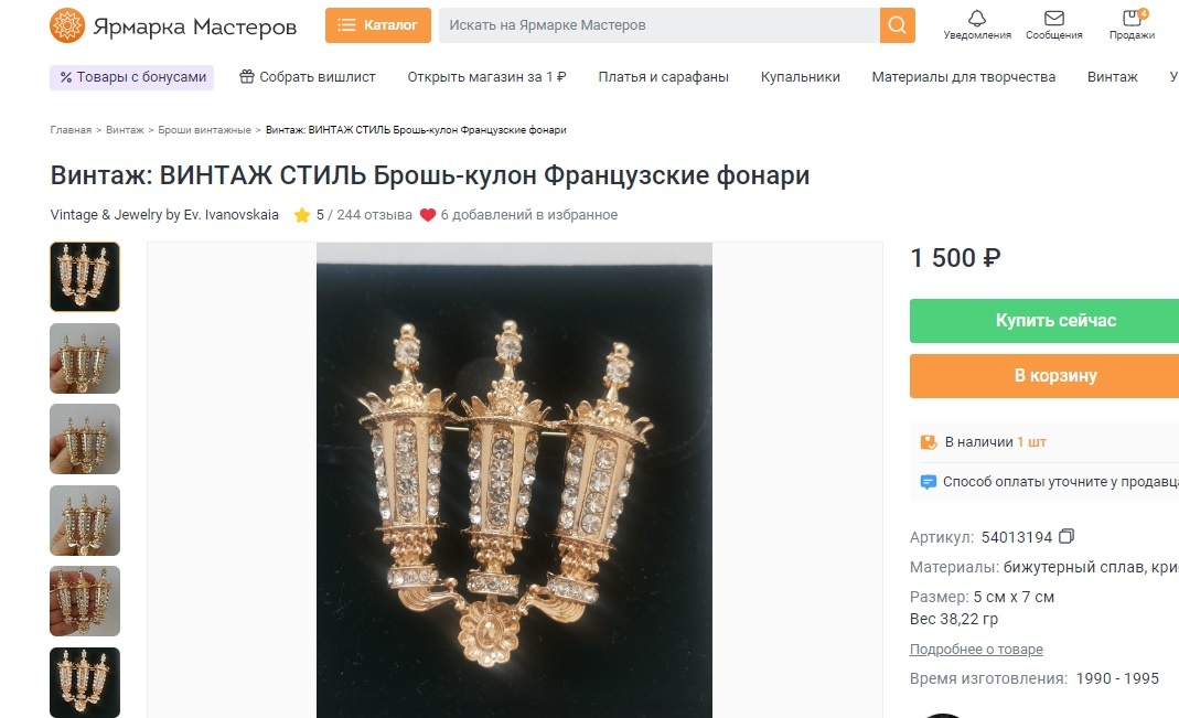 Эпизод 1 На продажу выставлена брошь. Ее разместили в разделе - Броши винтажные и назвали - "ВИНТАЖ СТИЛЬ Брошь-кулон Французские фонари". Дана информация о времени изготовления броши - 1990-1995 годы." По годам изготовления - уже винтаж, но продавец в названии написал - винтаж стиль. Посмотрим на брошь поближе. Выглядит симпатично. И вот оборот броши. А застежка нам показала, что вот как-то не в 1990-е годы прошлого века была изготовлена брошь. И сейчас ее можно купить вот здесь. Вот брошь вблизи. А вот оригинал броши, изготовлена компанией KJL, имеет название - Streets of Paris Lamp Light (Уличные фонари Парижа). Вот эта брошь была изготовлена в 1990-е годы. Вот так она выглядит. И оборот броши с маркировкой. Брошь маркирована Посмотрим на оригинал (слева) и копию (справа). Броши очень похожи. А вот оборот. Оригинал (слева) и копия (справа). Различий много: качество обработки металла, цвет металла, качество застежки, отверстия, через которые видно напыление для игры света на встав
