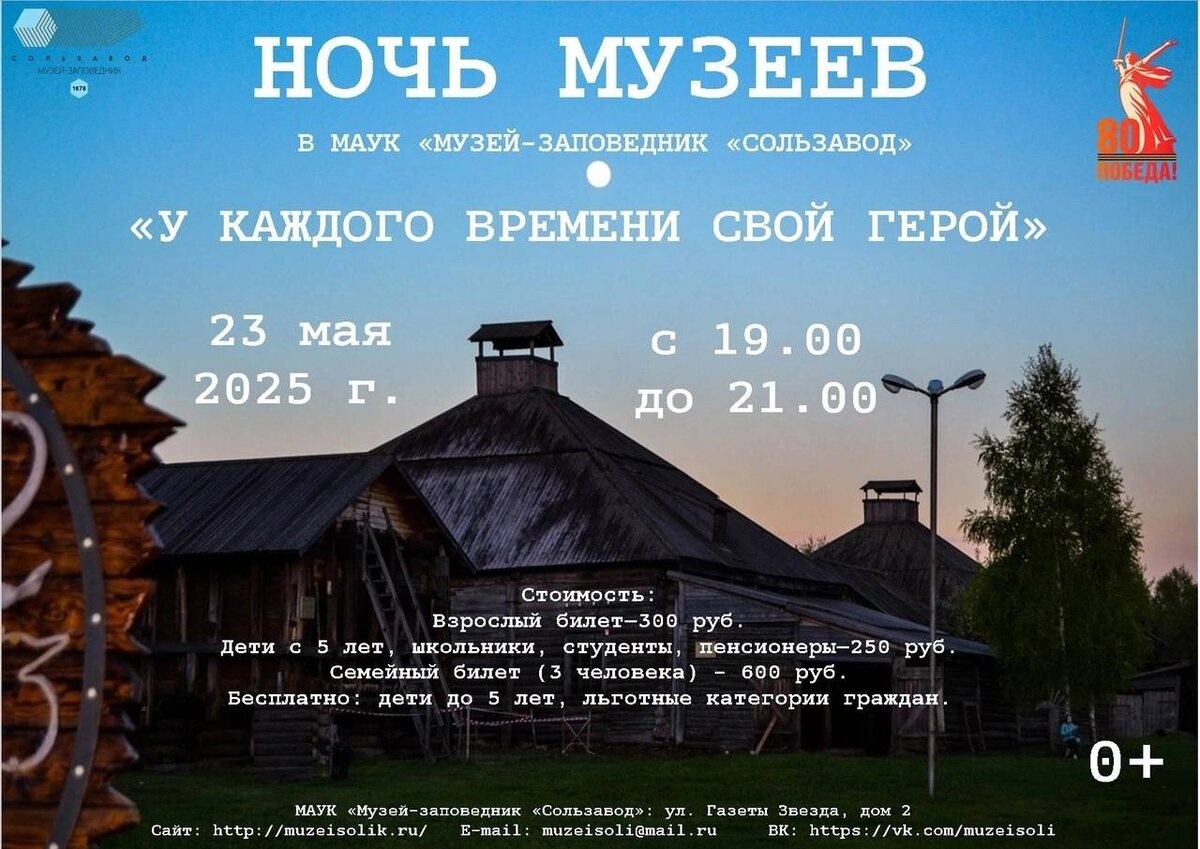 ✨ НОЧЬ МУЗЕЕВ НА «СОЛЬЗАВОДЕ» — ПУТЕШЕСТВИЕ ВО ВРЕМЕНИ *23 мая | 19:00 | Музей-заповедник «Сользавод»* В этом году акция посвящена 80-летию Победы и пройдёт под девизом «У каждого времени свой герой». В программе: 🔸 «Солёная разведка» — квест по тайнам военного тыла 🔸 Экскурсия-реконструкция — как солевары ковали Победу 🔸 Мастер-классы по старинным ремёслам (а вы знали, что солью даже рисовали?) 🔸 Ярмарка местных мастеров с «солёными» сувенирами 🔸 Запуск шара желаний под песни военных лет «Это не просто экскурсия — это живой диалог с историей», — обещают организаторы. 📌 Адрес: Соликамск, ул. Набережная, 98 📞 Запись: 8-951-94-94-442 (количество мест ограничено!) #СоликамскГордится #Сользавод #НочьМузеев2025
