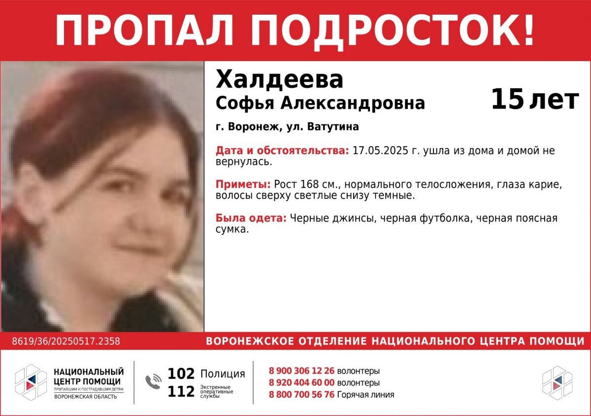 В Воронеже пропала 15-летняя Софья Халдеева. Девочка ушла из дома на улице Ватутина в субботу, 17 мая, и не вернулась. Ориентировку распространили волонтёры национального центра помощи. Рост Софьи – 168 сантиметров. У девушки карие глаза и нормальное телосложение. Волосы пропавшей светлого цвета снизу и тёмного цвета сверху. Она была одета в черные джинсы и черную футболку. На поясе у девушки была черная сумка. Если вам известна информация о возможном местонахождении Софьи Халдеевой - просьба сообщить об этом в полицию по номеру 112 или позвонить волонтерам по телефонам, указанным на ориентировке. Ранее волонтеры поискового отряда "ЛизаАлерт" сообщили о пропаже Георгия Цепаева. 46-летнего мужчину ищут в Воронеже с четверга, 15 мая.